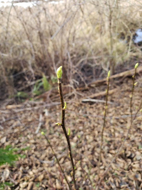 Today's walk covered some of the same route as that of the "Strange Weather" entry of a couple days ago. As I neared the spot where I took the photo of the unidentified bush that was first in my previous blog entry, I saw there was a wetlands restoration volunteer taking cuttings off that same bush. In response to my question, he told me it was an "Indian Plum" and that he was taking cuttings to make new starts for other restoration projects.