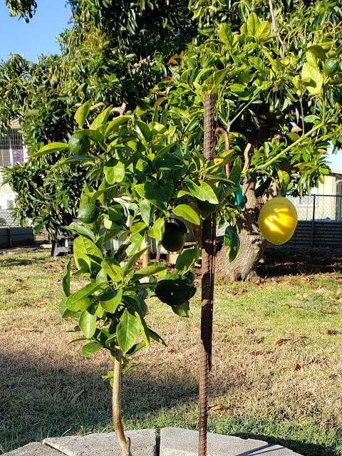 A lemon tree doing its thing. The blocks around the base keep away the wild chickens who love to scratch in the fresh dirt around his plantings.